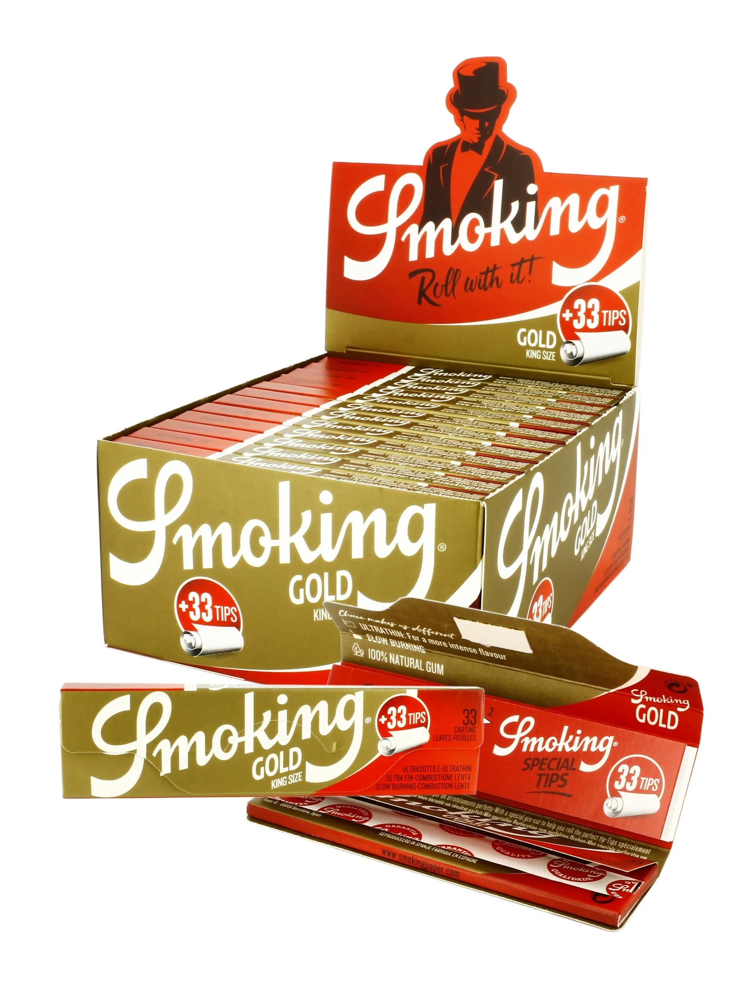- Premium gold-colored rolling papers that burn evenly and slowly